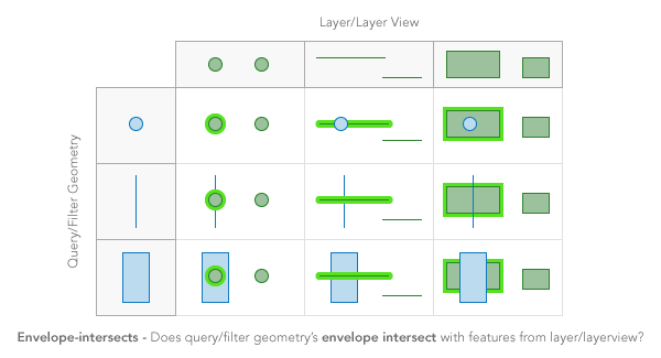envelope-intersectsspatial relationship returns features in the layer view that intersect the envelope (or extent) of the filter geometry.