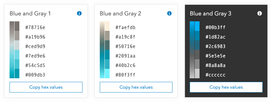 If your visualization must match a predefined theme using a set of colors, you may filter ramps by those colors using the appropriate tags. In the image below, we discovered three ramps, each with four colors containing both green and orange hues. Click the Copy hex values button in the ramp's card to copy the hex values in the ramp to your clipboard.